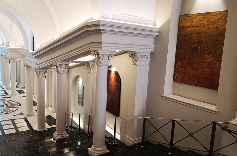 The floors in all the main public areas are in elaborately-patterned marble, echoing motifs from St Peter's and other Roman churches by Bernini. Bands of Estremoz marble frame the patterned areas and help define the architectural and structural grid. The radical design of the Compass Hall revolves around a central sun/compass which highlights the new orientation of the building at this point and directs visitors to the main stairway and the South Gallery. Magnificent stairway inspired by a Bernini original in the Vatican, it leads to the entrance Atrium on the main floor of the Gallery. The marble steps with their carefully-measured height rise between freestanding columns and walls decorated with niches on either side. The Stairway broadens out invitingly as it descends and leads to a hall dominated by succeeding arches accessing the lifts to the north, and then, to the right, runs through the Gallery with its sky-lighted six floors.